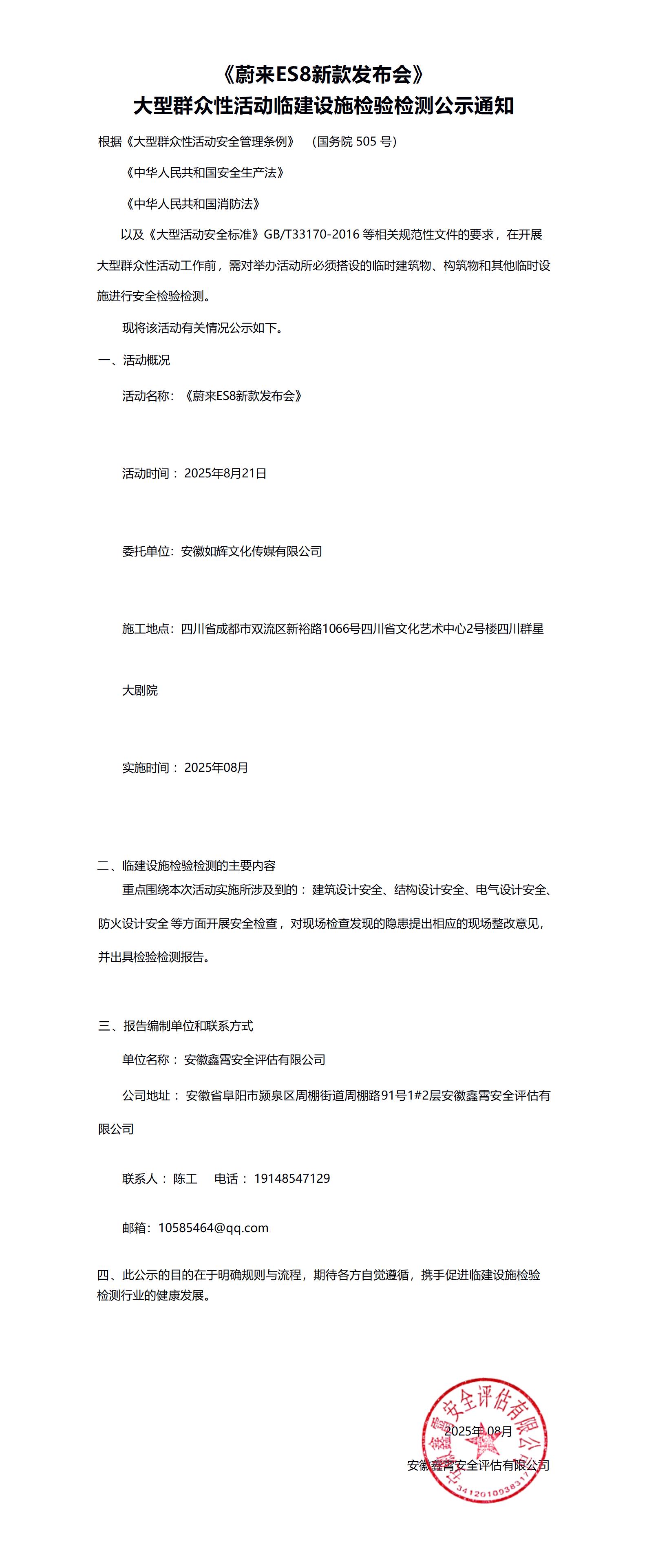 《蔚来ES8新款发布会》 大型群众性活动临建设施检验检测公示通知