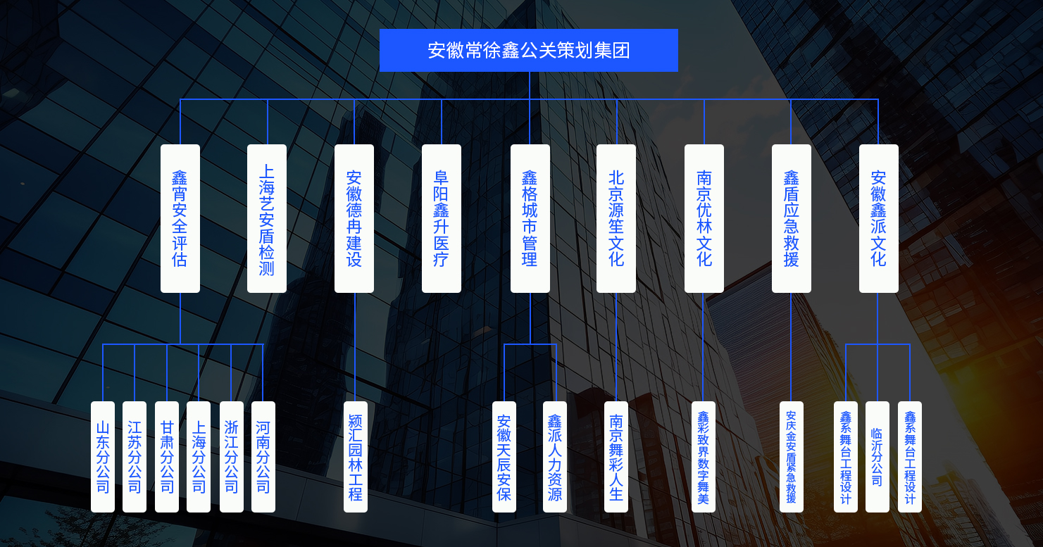 集团业务横跨公关策划、医疗健康、建筑工程、民生服务、人力资源、安全应急、数字舞美、广告创意、城市治理九大板块,旗下拥有15家专业子公司: